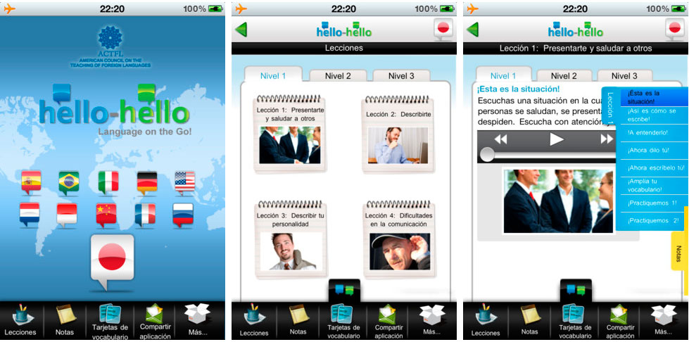 Hello-Hello Japonés es un curso de idioma completamente desarrollado, con 30 LECCIONES desarrolladas en colaboración con el Consejo Estadounidense para la Enseñanza de Lenguas Extranjeras (ACTFL), así puede estar seguro de que estas lecciones siguen una metodología eficaz y basada en investigación. Todas las lecciones son conversacionales basadas en diálogos y situaciones realistas, en lugar de ser una colección de palabras y frases fuera de contexto. Sigue leyendo